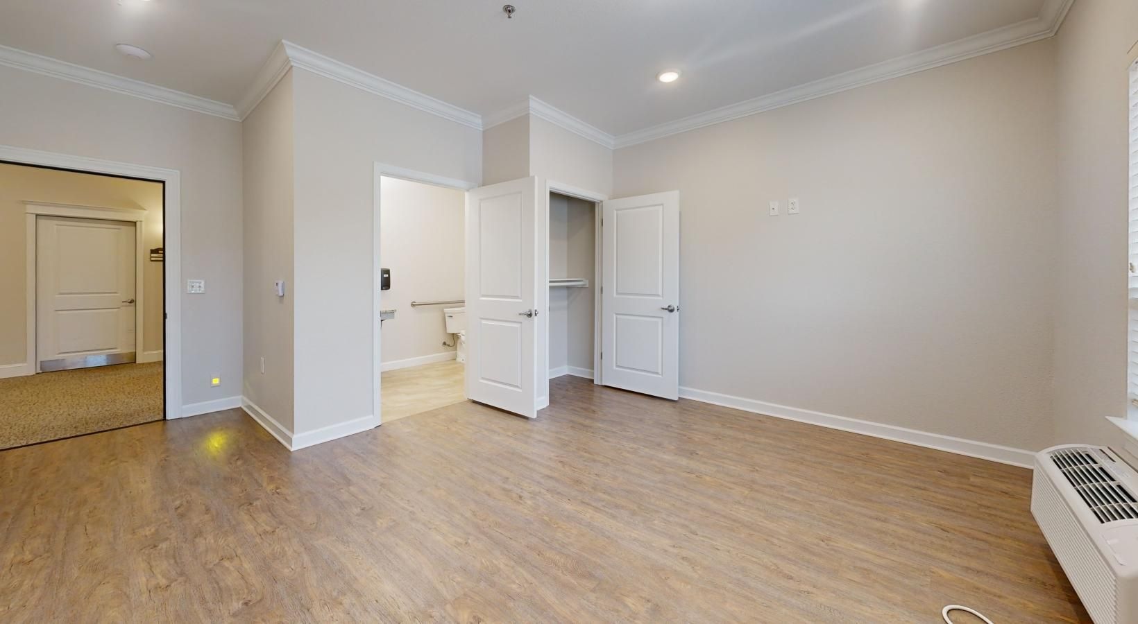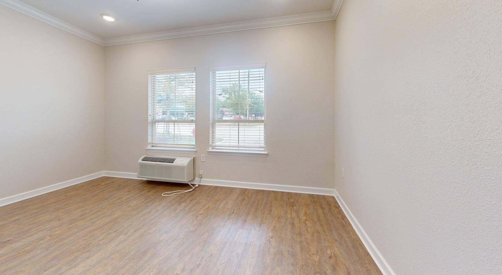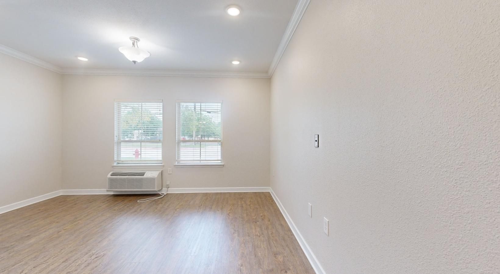 • a room with a wood floor and a window