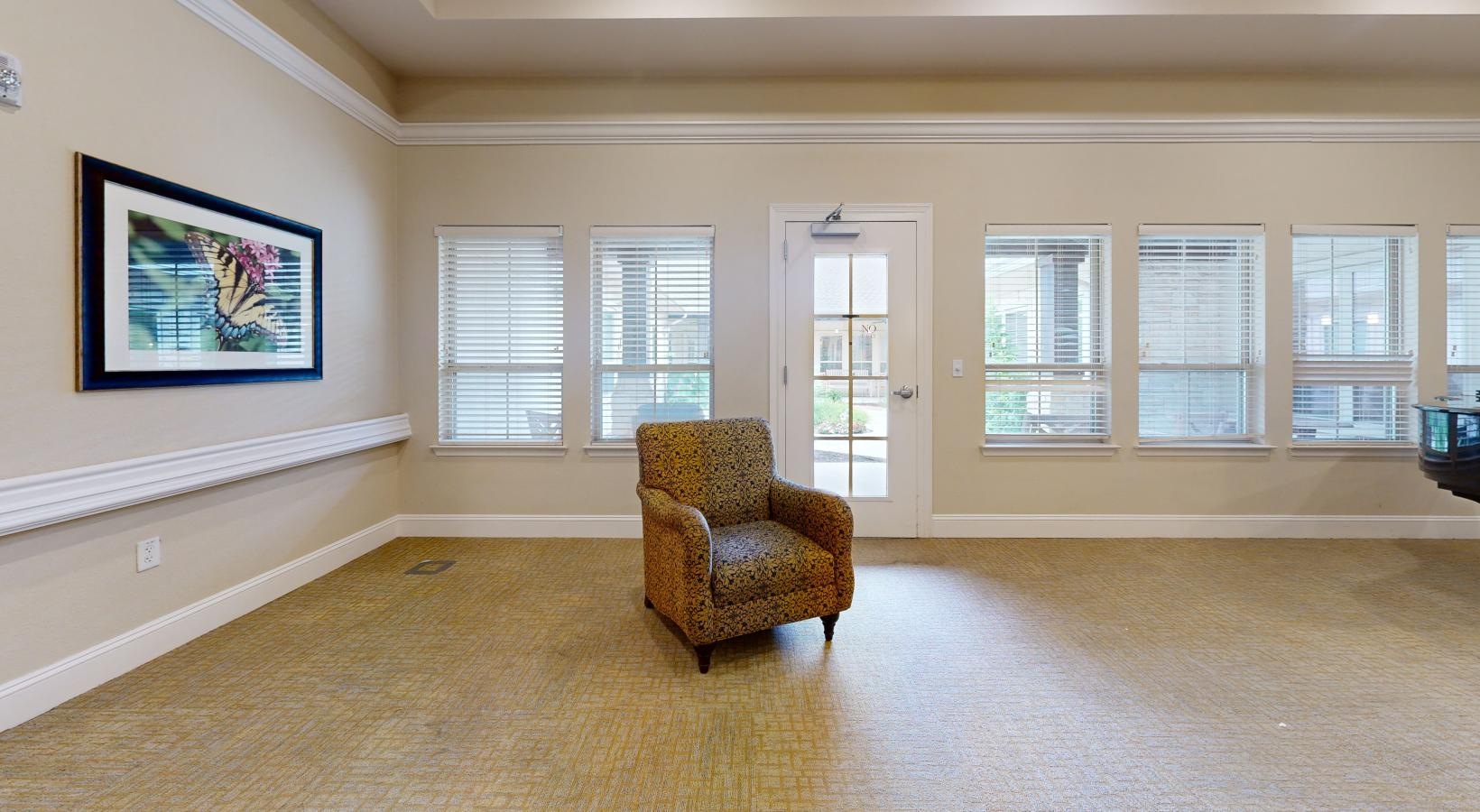 • a large room with a chair and a table
