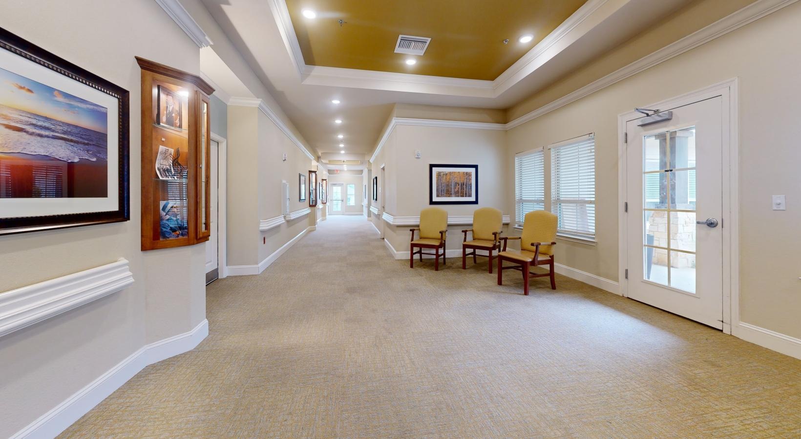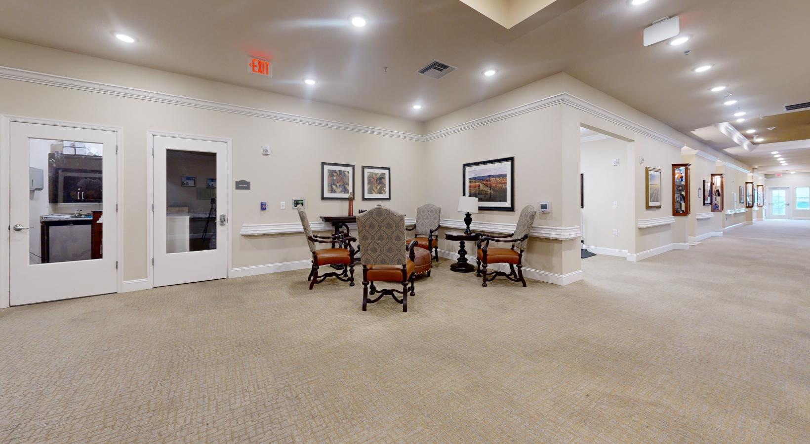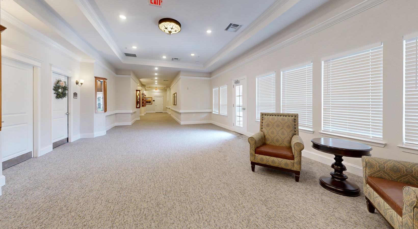 • a long hallway with chairs and a table
