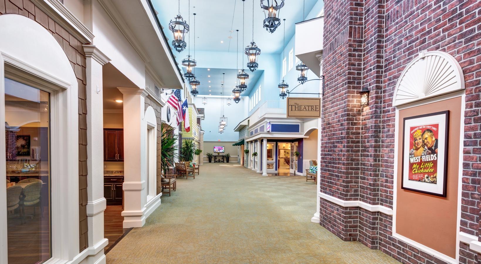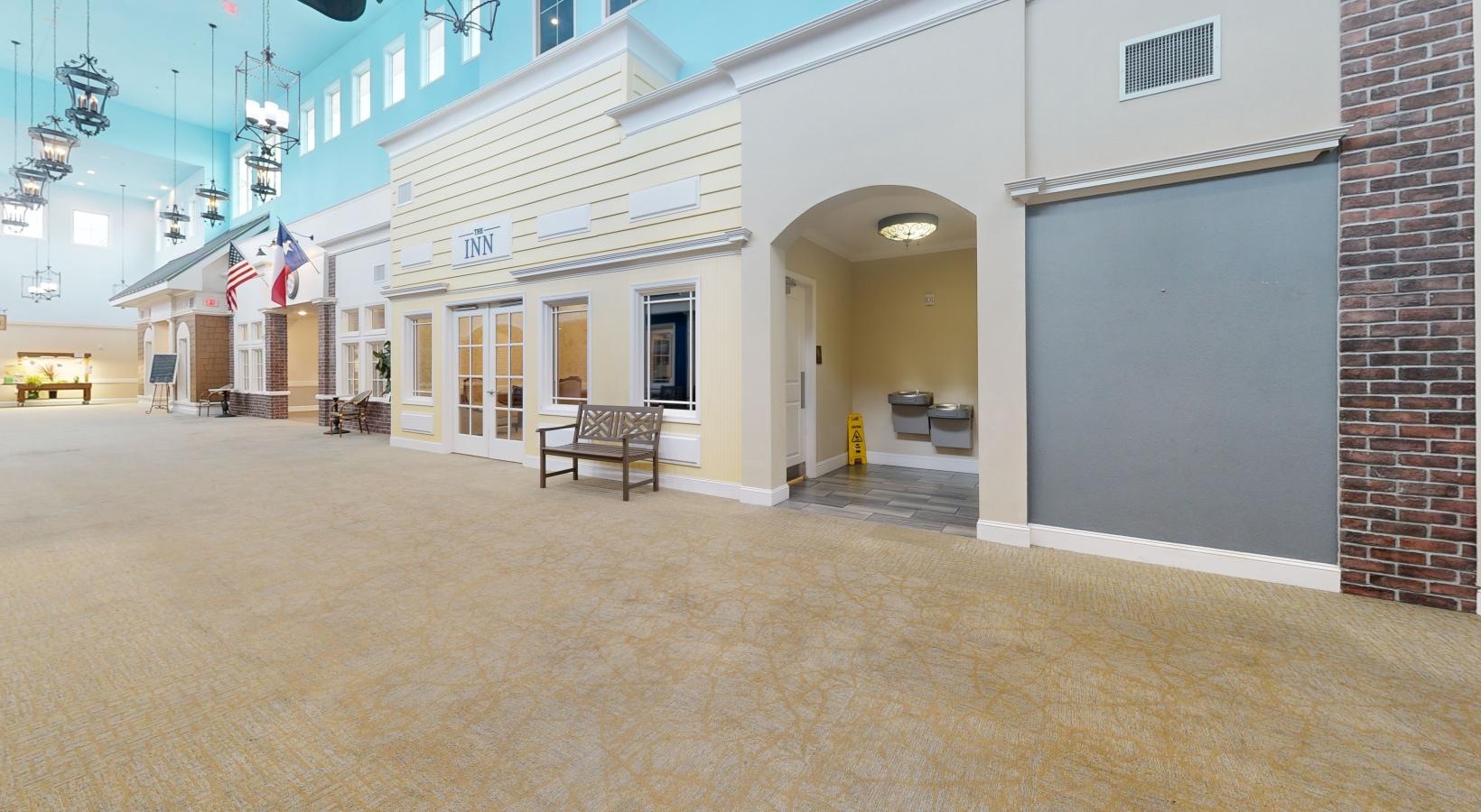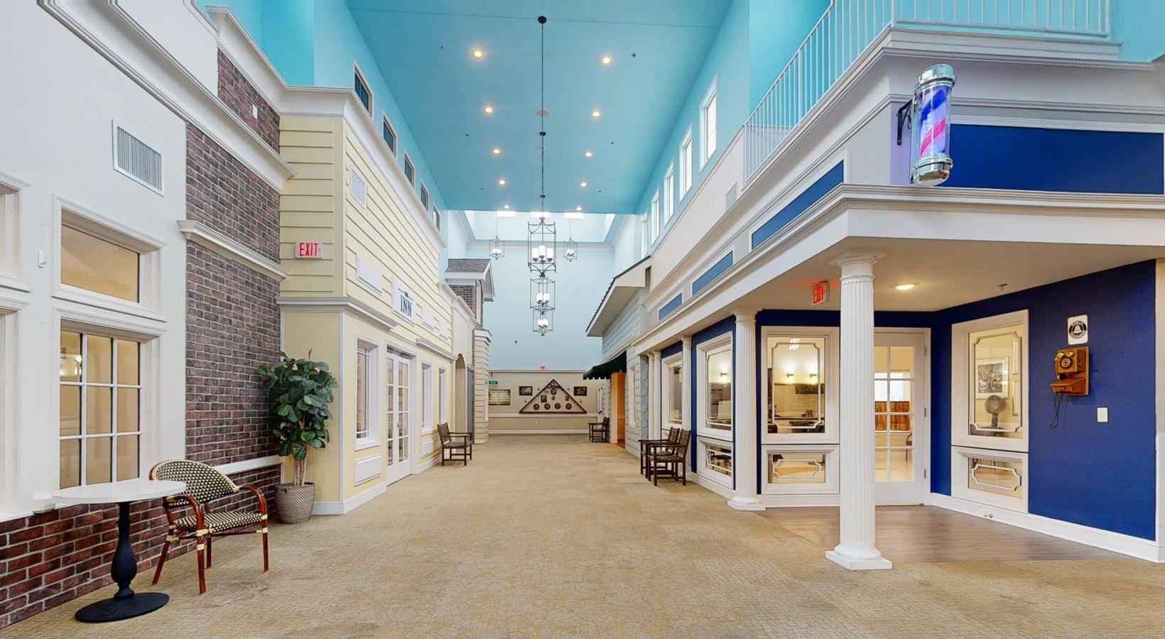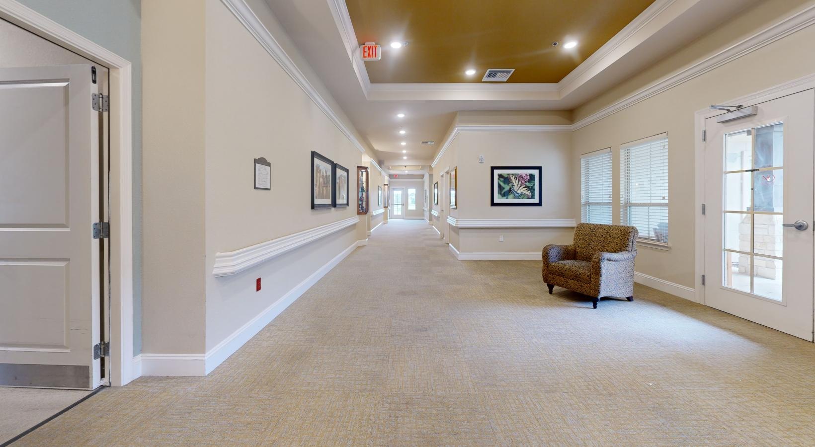 • a long hallway with chairs and a table