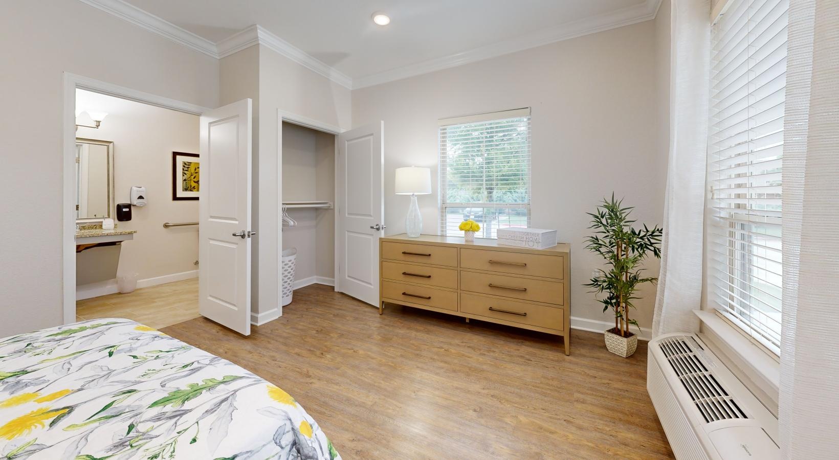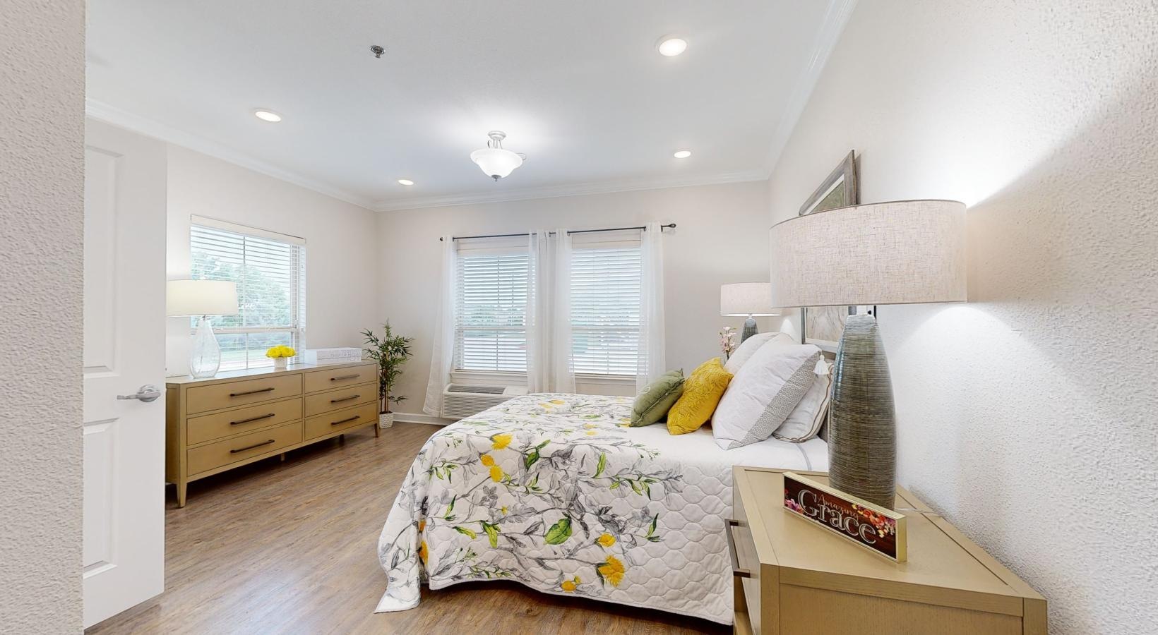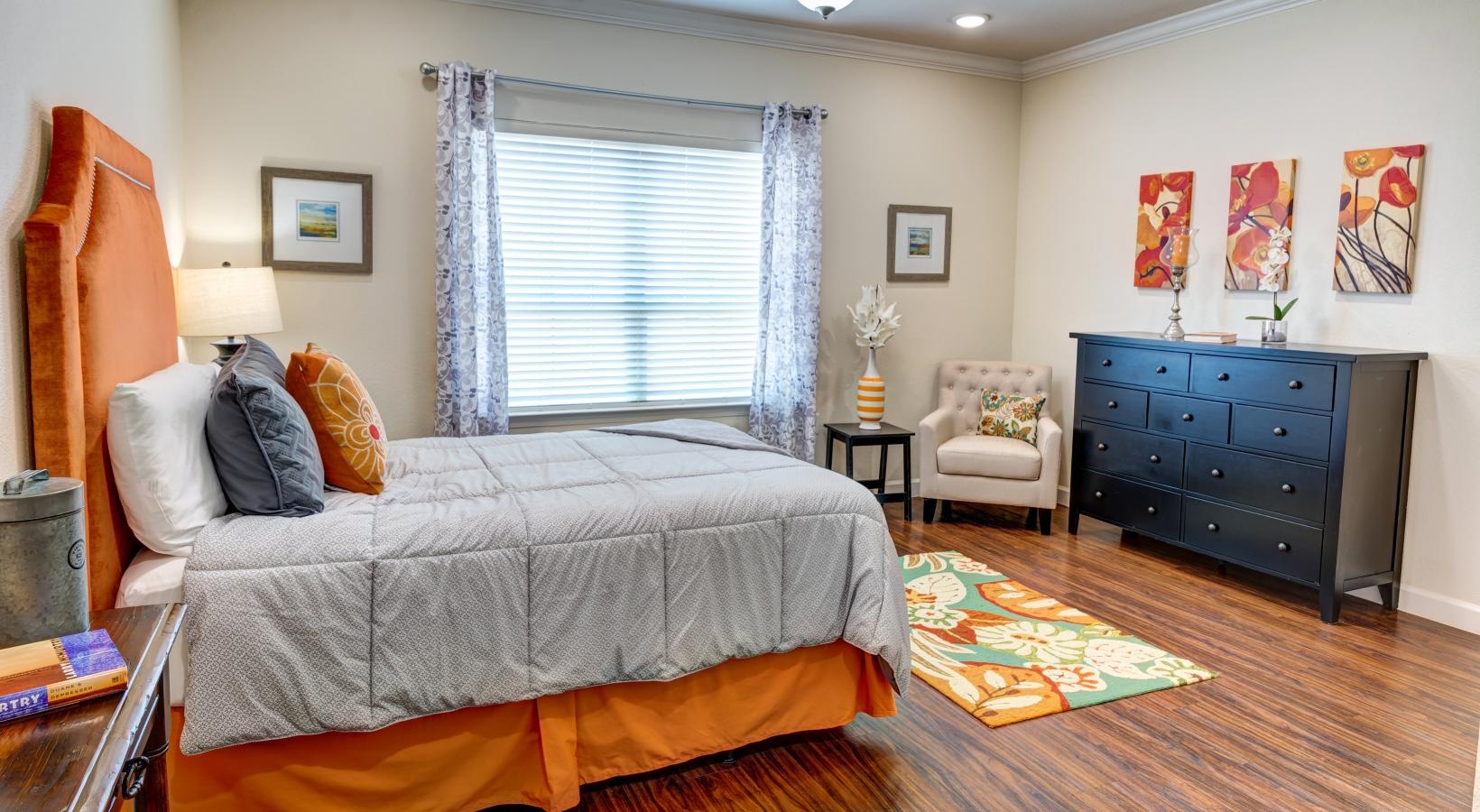 • a bedroom with a bed and dresser