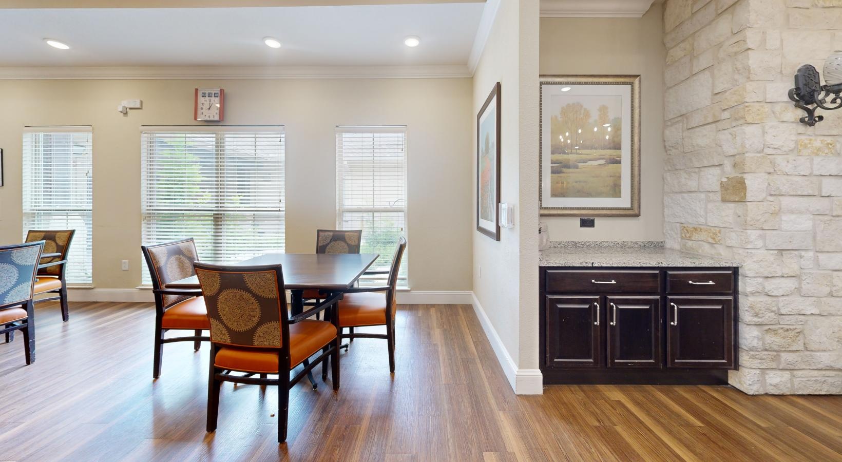 • a dining room with a table and chairs