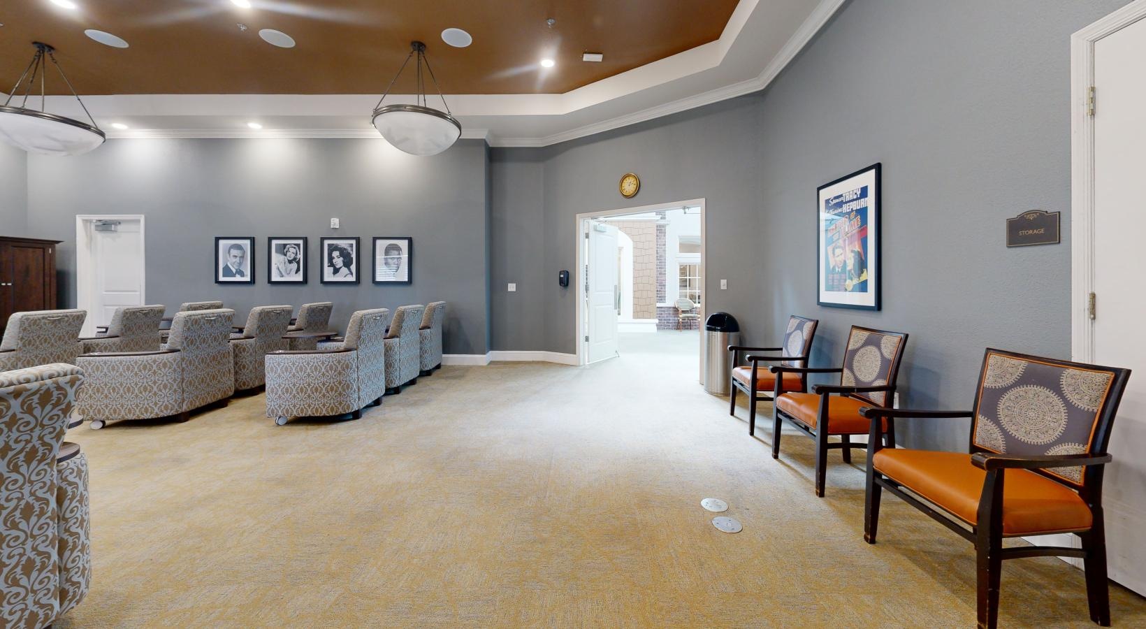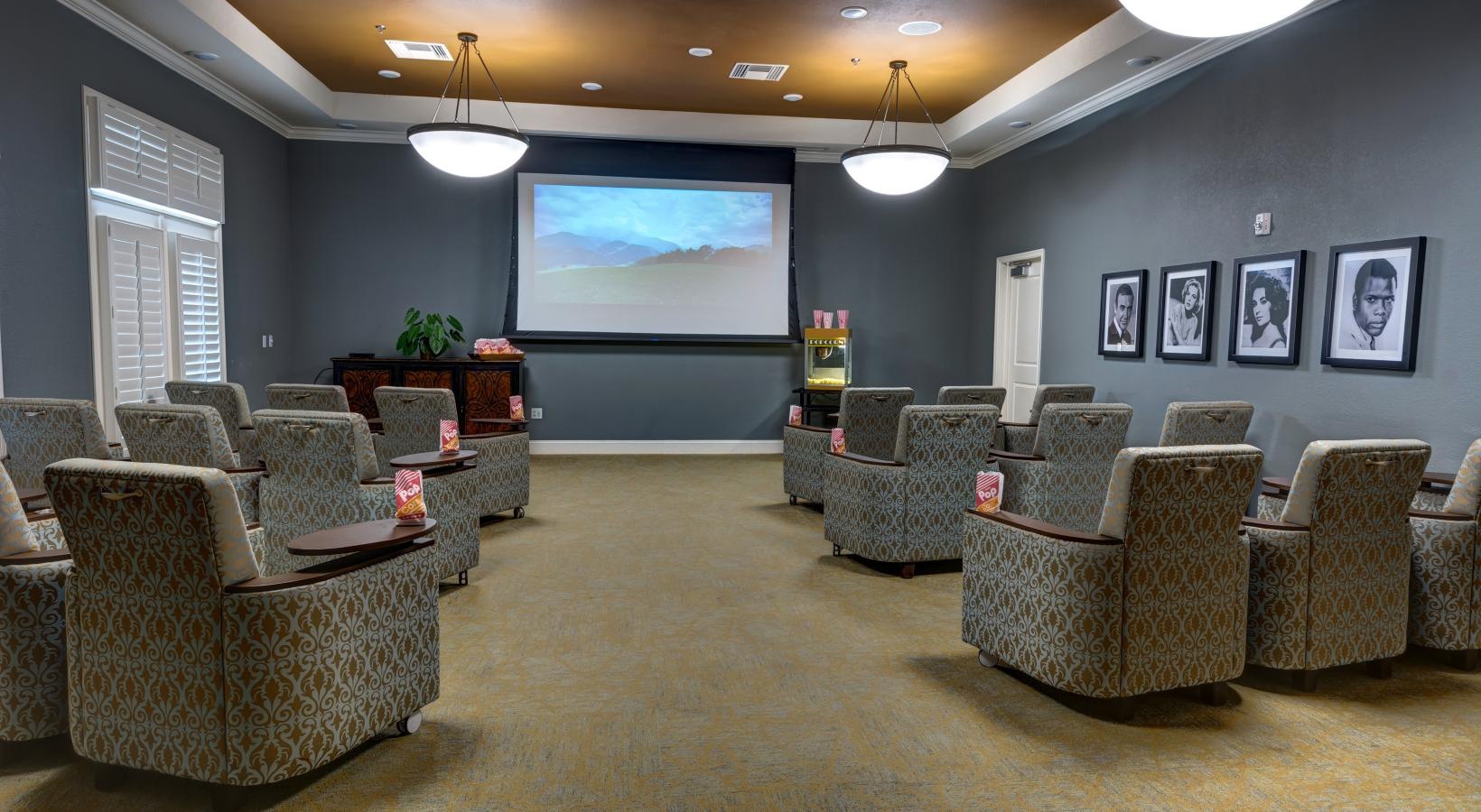 • a room with a large screen and chairs