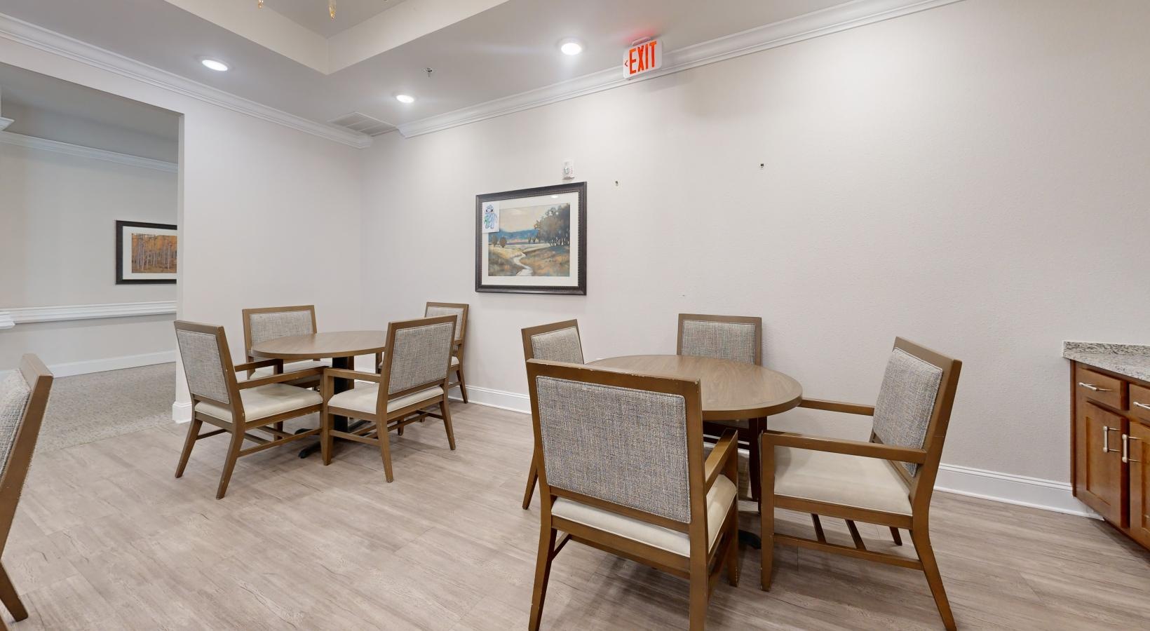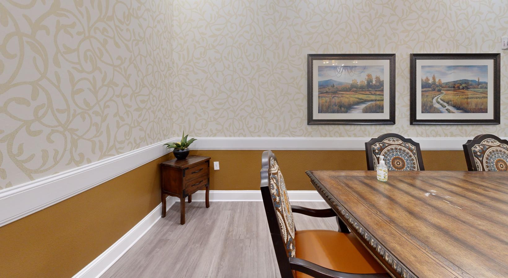 • a room with a table chairs and a painting on the wall