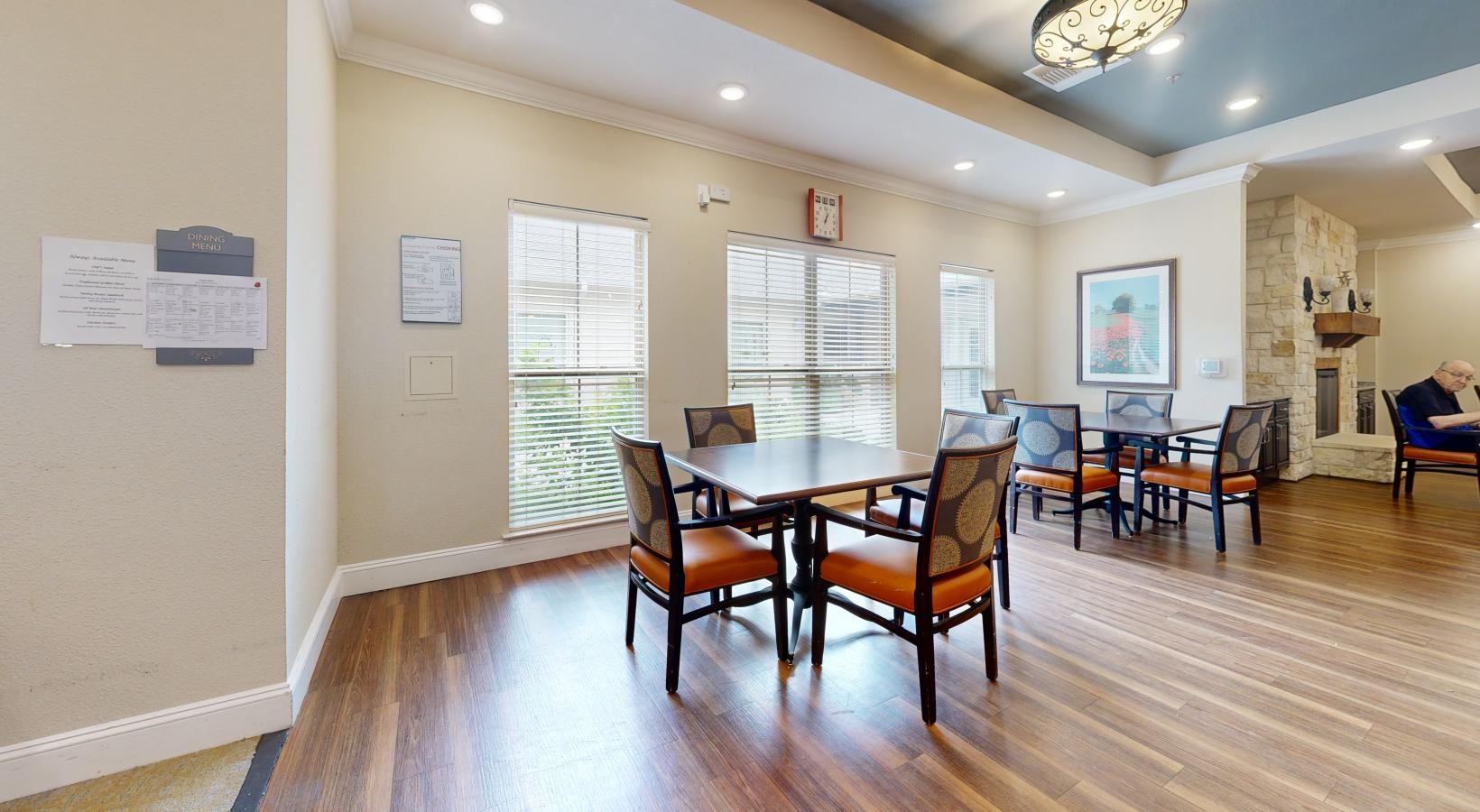 • a large room with a dining table and chairs