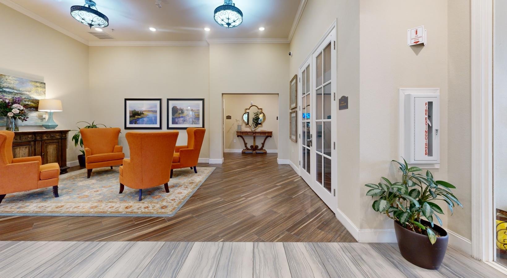 • a room with a wood floor and orange chairs
